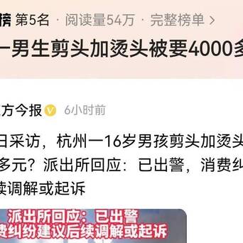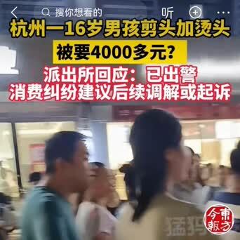 【连16岁的孩子都坑,该管管杭州的理发店了】近日,在浙江杭州,一位16岁的男生,去理发店理发时,对方标价是300多元,可不料结账的时候,直接变成了4000多元。男生报警以后,警方虽然出警,但却表示是消费纠纷,派出所也没有办法,建议调解或者起诉。