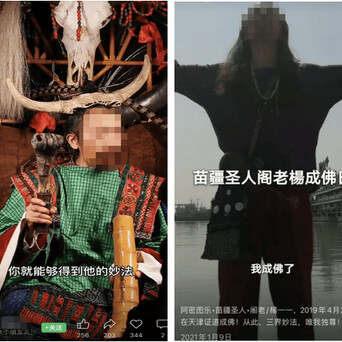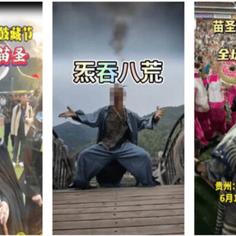 杨某某借助活动热度迅速蹿红网络后,利用广大网友对少数民族神话传说的猎奇心理,将自身包装成苗族所谓的“苗圣”形象,以宣传“苗族文化”“蚩尤文化”为名,在网络平台大量编造发布“苗族巫蛊术”“上古大神仙智慧”“科学修炼养生健康文化”“生命科学”等音视频内容,获得大批粉丝关注讨论。